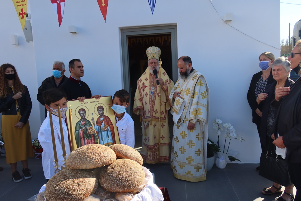 Με την παρουσία πλήθους πιστών, τηρούντων τα διατεταγμένα μέτρα υγειονομικής προστασίας, ο Σεβασμιώτατος κ. Δωρόθεος Β΄ τέλεσε απόψε, στην περιοχή Μαράθι Μυκόνου, τα Θυρανοίξια ιερού Παρεκκλησίου αφιερωμένου στη Γέννηση του Κυρίου και τους Αγίους Αναργύρους Κοσμά και Δαμιανό, το οποίο ανήγειρε φιλογενής οικογένεια της Μυκόνου.
