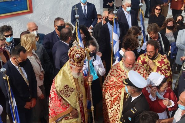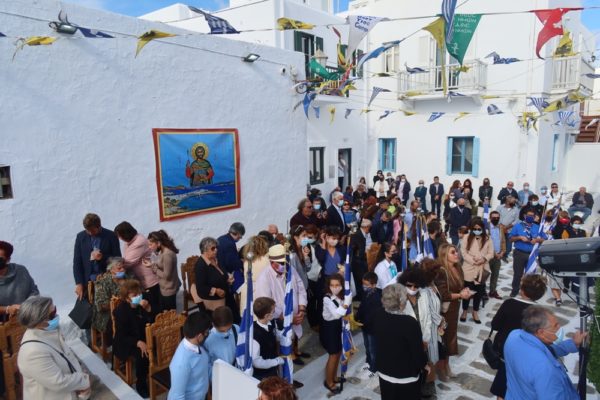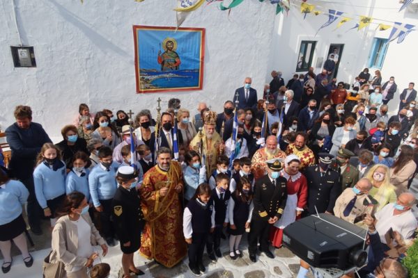 Στον Ιερό, πάλαι ποτέ Ενοριακό Nαό του Αγίου Αρτεμίου, στην περιοχή “Νιοχώρι”,στη Χώρα της Μυκόνου, τελέσθηκε Εὀρτιος Εσπερινός και Αρχιερατική Θεία Λειτουργία, ιερουργήσαντος του Σεβασμιωτάτου κ. Δωροθέου Β’ , ο οποίος μετέβη στον Ιερό Ναό άμα τη αφίξει αεροπορικώς από την Κέρκυρα, με την παρουσία των Βουλευτών Κυκλάδων της Νέας Δημοκρατίας κας Αικατ. Μονογυιού και Φιλίππου Φόρτωμα, του Αντιπεριφερειάρχη Διαφάνειας κ. Πρίγκου, του Δημάρχου Μυκόνου κ. Κωνστ. Κουκά,Αντιδημάρχων και Δημοτικών Συμβούλων, του Λιμενάρχη Μυκόνου, του Διοικητή του Αστυνομικού Τμήματος Μυκόνου, του Διοικητή του ΤΕ Άνδρου, Μελών των Πολιτιστικών Συλλόγων «ΜΑΝΤΩ» και «ΑΝΕΜΟΜΥΛΟΙ», Προσκόπων, των σημαιοφόρων των Εκπαιδευτηρίων της Μυκόνου με τις σημαίες τους και πλήθους Μυκονίων πιστών εντός και εκτός του Ναού, οι οποίοι προσήλθαν τηρούντες τα προβλεπόμενα μέτρα προστασίας.