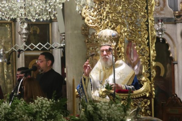 Ο Σεβασμιωτατος κ. Δωρόθεος Β’ απηύθυνε προς το συγκεντρωμένο μέγα πλήθος των Συριανών, οι οποίοι είχαν κατακλύσει τις αποβάθρες του λιμανιού, σύντομη χαιρετιστήρια και εόρτια προσλαλιά, τονίζοντας μεταξύ άλλων τον πολυαιώνιο σύνδεσμο με τη θάλασσα της Ελλάδος μιας χώρας αφρογεννημένης και αφροτυλιγμένης, της οποίας η ιστορία και η καθημερινότητα, οι πόθοι και τα πάθη της, η ποίησή της, η πράξη και όραμά της, ταυτίζονται με τη θάλασσα. Αναφέρθη, επίσης, στο λαμπρό παρελθόν και το δυναμικό παρόν της Σύρας και της Ερμούπολης, που δικαίως κατέχουν τα σκήπτρα και τα πρωτεία μεταξύ των νησιών του Αρχιπελάγους.