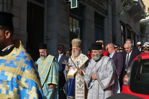Μετά και την τελετή του Μεγάλου Αγιασμού, εγένετο λαμπρή λιτάνευση, κατά το έθος και με πλήρη Εκκλησιαστική τάξη, προπορευόμενου του Σεβασμιωτάτου κ. Δωροθέου Β’, με τη συμμετοχή του ιερού Κλήρου της Σύρου, τελεταρχούντος του Αρχιερατικού Επιτρόπου, Πρωτοπρ. Φλαβιανού Αλμπέσκου, του Κουβουκλίου με τον Τίμιο Σταυρό, φερομένου επί των ώμων ανδρών του Λιμενικού Σώματος, με επικεφαλής τη φιλαρμονική του Δήμου Σύρου-Ερμούπολης, πλαισιουμένη από άγημα της ΠΝΒ Σύρου, νέες του Λυκείου Ελληνίδων και Προσκόπους, η οποία κατευθύνθηκε προς τον έμπροσθεν του Μνημείου της Εθνικής Αντίστασης προευτρεπισμένο χώρο του λιμένος της Ερμούπολης.