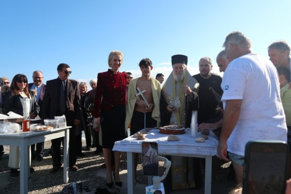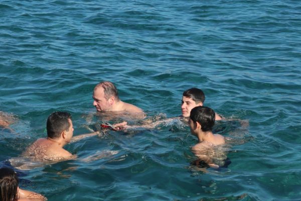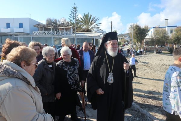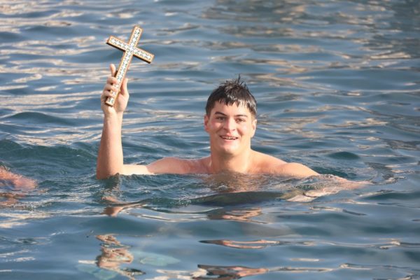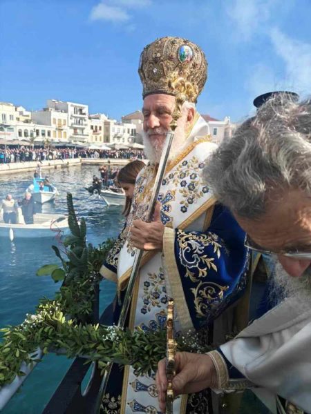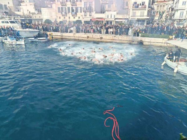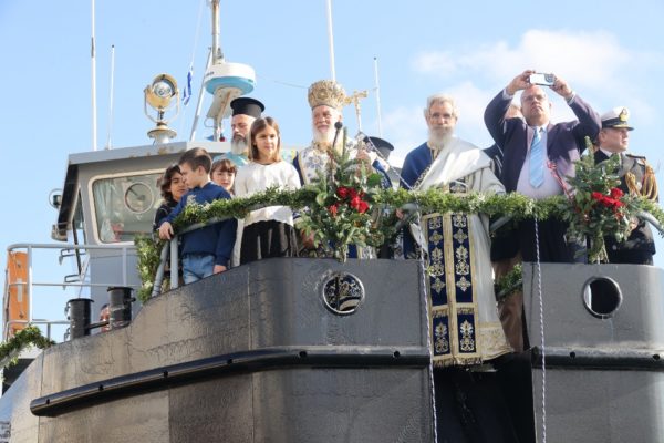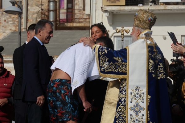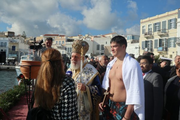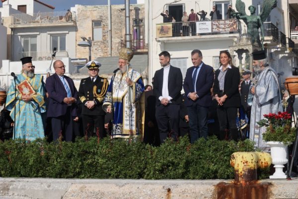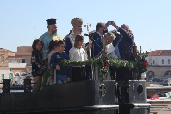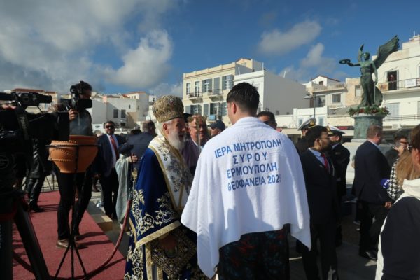 Εν συνεχεία, με την παρουσία και των άρτι αφιχθέντων Υπουργού Αναπληρωτή Παιδείας και Αθλητισμού κ. Ιω. Βρούτση, τον οποίο συνόδευαν ο χρυσός Ολυμπιονίκης στο τάεκβοντό Μιχάλης Μουρούτσοςκαι η ολυμπιονίκης στην υδατοσφαίριση, Αλεξάνδρα Ασημάκη, και του εκπροσωπούντος τον κ. Αρχηγό του Λιμενικού Σώματος κ. Β΄ Υπαρχηγού Λιμενικού Σώματος – Ελληνικής Ακτοφυλακής Αντιναυάρχου Λ.Σ. Τρύφωνος Κοντιζά, ο Σεβασμιώτατος κ. Δωρόθεος Β’ επέβη σκάφους του Λιμενικού Σώματος, από την πλώρη του οποίου έρριψε το Σταυρό στη θάλασσα, τον οποίο έσπευσαν να ανασύρουν τολμηροί νέοι και τον οποίο ανέσυρε ο Μαθητής Β’ Λυκείου Βασίλης Κορφιάτης, υπό τα χειροκροτήματα των παρισταμένων τους εορταστικούς ελιγμούς του μόλις καταπλεύσαντος επιβατικού πλοίου «BLUE STAR NAXOS» , τους πανηγυρικούς συριγμούς των Πλωτών του Λιμεναρχείου Σύρου και του Νεωρίου, των Επαγγελματιών και Ερασιτεχνών Αλιέων, του Ομίλου Φουσκωτών και Ταχυπλόων Σκαφών Σύρου και του Σωματείου Λεμβούχων και Καβοδετών Σύρου, και υπό τις χαρμόσυνες κωδωνοκρουσίες, δημιουργώντας μια μεγαλειώδη εορταστική ατμόσφαιρα, που απέδειξε, όπως είπε ο Σεβασμιώτατος κ. Δωρόθεος Β’ ότι η Ερμούπολη είναι και αξίζει να είναι η Πρωτεύουσα πόλη των Κυκλάδων και της Περιφέρειας Ν. Αιγαίου.