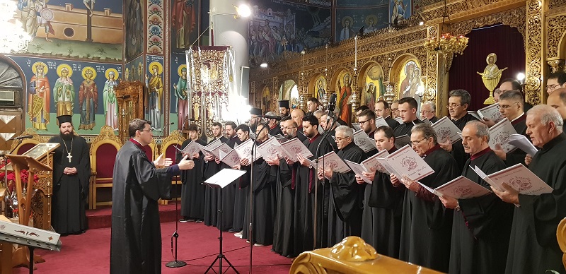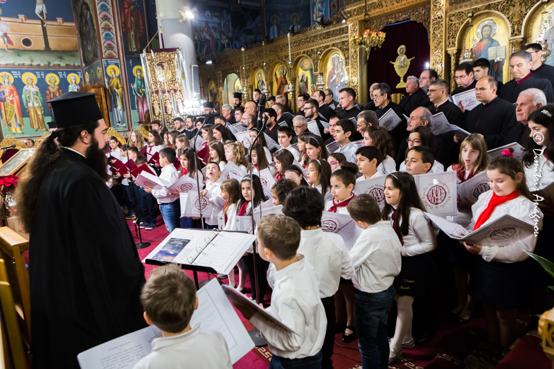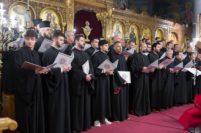 Πολυμελής Βυζαντινή Χορωδία της Σχολής Βυζαντινής Μουσικής της Ιεράς Μητροπόλεως «Γερμανός ο Μελωδός», υπό την καθοδήγηση του Διευθυντού και Πρωτοψάλτου κ. Ανδρέου Ιωακείμ απέδωσε θαυμάσια επίκαιρους Χριστουγεννιάτικους ύμνους, τους οποίους προλόγιζε ο Πανοσιολογιώτατος Αρχιμανδρίτης π. Αμβρόσιος Αναστασίου, Καθηγούμενος της Ιεράς Μονής Αντινίτσης, σχολιάζοντας με τρόπο καταληπτό τα ιερά κείμενα των ύμνων στην βάση των Πατέρων της Εκκλησίας μας.