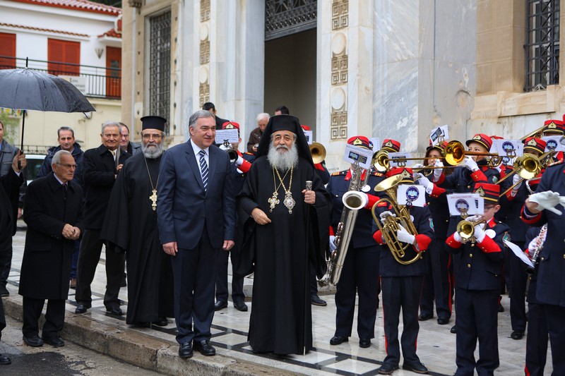 Ο κ. Μαντάς επέδωσε στον Σεβασμιώτατο, αντίγραφο του Μεταλλίου του Τιμητικού Βραβείου Γραμμάτων & Καλών Τεχνών, με το οποίο τιμήθηκε προσφάτως η Δημοτική μας Φιλαρμονική, από το ανώτατο Πνευματικό Ίδρυμα της χώρας μας, την Ακαδημία Αθηνών, ως αναγνώριση δια την εκατονταετή λειτουργία και παρουσία της, καθώς και για προσφορά της στον Μουσικό κόσμο και Πολιτισμό της χώρας μας, το οποίο και θα τοποθετηθεί στο Ιστορικό Μουσείο της Ιεράς Μητροπόλεως.