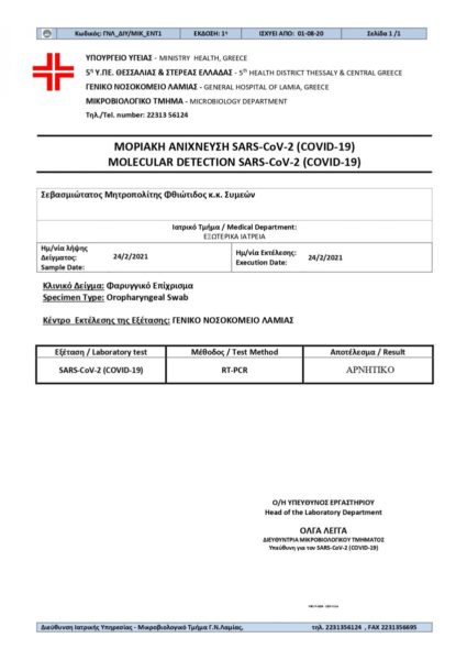 Η Ιερά Μητρόπολη Φθιώτιδος εξέδωσε ανακοίνωση σύμφωνα με την οποία ενημερώνει ότι ο Σεβασμιώτατος Μητροπολίτης Φθιώτιδος κ. Συμεών σε όλα τα διαγνωστικά τεστ (rapid test και μοριακά RT-PCR) ανίχνευσης του κορωνοϊού, στα οποία υποβλήθηκε κατά την διάρκεια της μέχρι σήμερα οικειοθελούς προληπτικής απομονώσεώς του βρέθηκε αρνητικός στον Covid-19, όπως και στο σημερινό επαναληπτικό μοριακό τεστ ανίχνευσης (βλ. συνημμένο), στο οποίο επίσης ήταν αρνητικός.