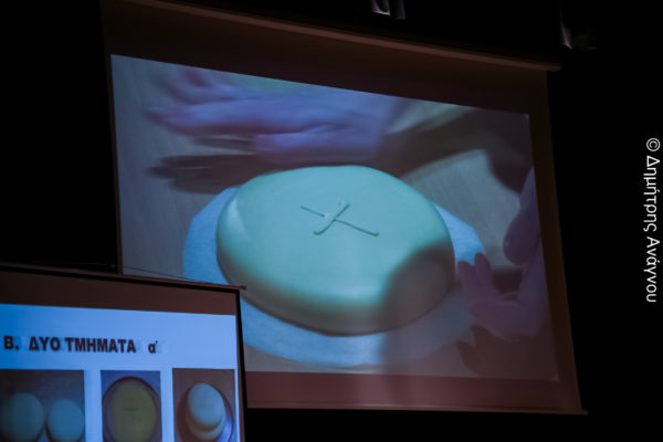 Σε αυτό το μάθημα  διδάχθηκε η πρακτική  του διπλού προσφόρου (με τους δύο δίσκους ζύμης), βήμα βήμα επεξηγηματικά, με προβολή του ζυμώματος στη μεγάλη οθόνη του Αμφιθεάτρου, έτσι ώστε να αποκτηθεί η βαθιά γνώση και να εμπεδωθεί η σωστή, εύκολη και ασφαλής τέχνη του ζυμώματος του προσφόρου από την συνεργάτιδα και εκπαιδευτικό της Σχολής Προσφόρου κ. ΠαρασκευὴΖούγρου, διαιτολόγο – διατροφολόγο, παρουσία και του υπευθύνου καθηγητού της Σχολής κ. Κωνσταντίνου Τσαπάρα, Εκπαιδευτικό.