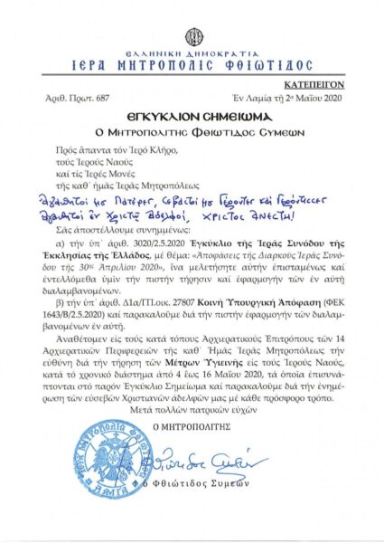 Με κατεπείγουσα Εγκύκλιο προς άπαντα τον Ιερό Κλήρο, τους Ιερούς Ναούς και τις Ιερές Μονές της Μητροπολιτικής μας Περιφερείας, ο Σεβασμιώτατος Μητροπολίτης Φθιώτιδος κ. Συμεών διαβίβασε την σχετική Εγκύκλιο της Ιεράς Συνόδου της Εκκλησίας της Ελλάδος και την νέα Κοινή Υπουργική Απόφαση, που θα ισχύσει από την Δευτέρα 4 Μαϊου 2020 έως και το Σάββατο 16 Μαϊου 2020, και η οποία πλέον επιτρέπει την προσέλευση των πιστών στους Ιερούς Ναούς για ατομική προσευχή ρυθμίζοντας λεπτομερώς τα μέτρα υγιεινής, τα οποία θα πρέπει να τηρούνται με ευθύνη των κατά τόπους Αρχιερατικών Επιτρόπων, των Προϊσταμένων των Ιερών Ναών αλλά και με την ατομική ευθύνη του κάθε πιστού.