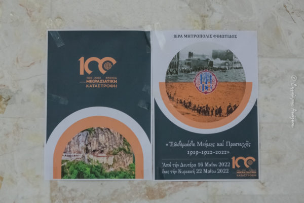 Συνεχίζονται επιτυχώς οι εκδηλώσεις μνήμης υπό τον τίτλο: «Εβδομάδα Μνήμης και Προσευχής 1919 -1922-2022» με αφορμή την επέτειο των 100 ετών από την Μικρασιατική Καταστροφή, υπό την αιγίδα της Ιεράς Μητρόπολης Φθιώτιδος, σε συνεργασία με πολιτιστικούς συλλόγους και φορείς της Φθιώτιδος.