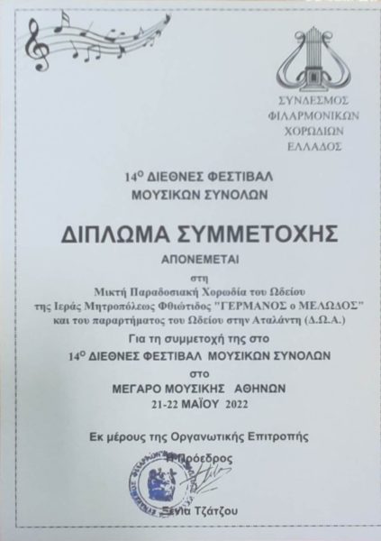 Με μια εντυπωσιακή εμφάνιση του Ωδείου της Ι.Μ. Φθιώτιδος «ΓΕΡΜΑΝΟΣ ο ΜΕΛΩΔΟΣ» ολοκληρώθηκε το 14ο Διεθνές Φεστιβάλ Μουσικών Συνόλων στο Μέγαρο Μουσικής Αθηνών την Κυριακή 22 Μαΐου 2022, μια διοργάνωση του Συνδέσμου Φιλαρμονικών Χορωδιών Ελλάδος, την οποία παρουσίασε η δημοσιογράφος Βίκυ Χαντζή.