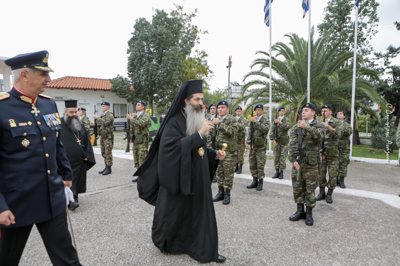 Τον Σεβασμιώτατο ανέμεναν στην είσοδο του Στρατοπέδου ο Ταξίαρχος, ο Υποδιοικητής και Διοικητές άλλων μονάδων καθώς και πολλοί Αξιωματικοί, ενώ τον συνόδευαν ο Πρωτοσύγκελλος της Ιεράς Μητροπόλεως Πανοσιολ. Αρχιμ. π. Άγγελος Ανθόπουλος , ο Γενικός Αρχιερατικός Επίτροπος Αιδεσιμολ. Πρωτ. π. Νεόφυτος Ραφαηλίδης και άλλοι συνεργάτες του Κληρικοί.