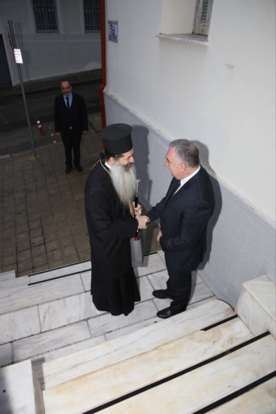 Λίγο πριν την πάνδημη υποδοχή του Ιερού Σκηνώματος του Οσίου Βησσαρίωνος του Αγαθωνίτου ο Σεβασμιώτατος Μητροπολίτης Φθιώτιδος κ. Συμεών επισκέφτηκε στο Δημαρχείο της Λαμίας τον εορτάζοντα Δήμαρχο Λαμιέων κ. Ευθύμιο Καραΐσκο, προκειμένου να του ευχηθεί για την ονομαστική του εορτή και για να τον ευχαριστήσει και για την συμβολή του Δήμου Λαμιέων στην διοργάνωση του τριημέρου πρώτου εορτασμού του Οσίου Βησσαρίωνος του Αγαθωνίτου.