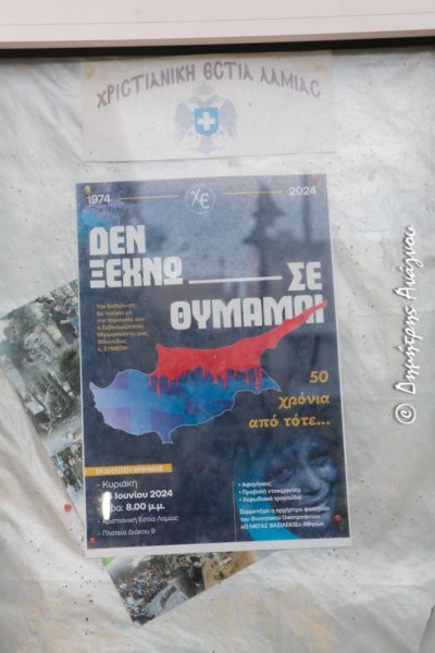 Με ιδιαίτερη επιτυχία και με την παρουσία του Μητροπολίτη Φθιώτιδος κ. Συμεών και πλήθους κόσμου πραγματοποιήθηκε η εκδήλωση μνήμης, το αφιέρωμα με τίτλο: «1974 Δεν Ξεχνώ – 2024 Σε Θυμάμαι» με αφορμή την συμπλήρωση 50 ετών από την τουρκική εισβολή στην Κύπρο, την οποία διοργάνωσε η Χριστιανική Εστία Λαμίας, στο πλαίσιο της αγαστής, αρμονικής και υποδειγματικής συνεργασίας με την Ιερά Μητρόπολη Φθιώτιδος και κάτω από την πνευματική καθοδήγηση του Σεβασμιωτάτου.