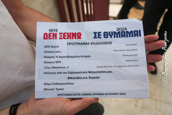 Με ιδιαίτερη επιτυχία και με την παρουσία του Μητροπολίτη Φθιώτιδος κ. Συμεών και πλήθους κόσμου πραγματοποιήθηκε η εκδήλωση μνήμης, το αφιέρωμα με τίτλο: «1974 Δεν Ξεχνώ – 2024 Σε Θυμάμαι» με αφορμή την συμπλήρωση 50 ετών από την τουρκική εισβολή στην Κύπρο, την οποία διοργάνωσε η Χριστιανική Εστία Λαμίας, στο πλαίσιο της αγαστής, αρμονικής και υποδειγματικής συνεργασίας με την Ιερά Μητρόπολη Φθιώτιδος και κάτω από την πνευματική καθοδήγηση του Σεβασμιωτάτου.