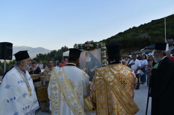 Παρουσία Καθηγουμένων της Ιεράς Μητροπόλεως, πλήθους ιερέων, των τοπικών αρχόντων και πλήθους πιστού λαού, παρά τον καύσωνα των ημερών, ο Σεβασμιώτατος κ. Συμεών εκόμισε στον προς Εγκαινισμό Ναό του Οσίου Παϊσίου τα Ιερά Λείψανα των Αγίων Μαρτύρων, Πολυκάρπου Επισκόπου Σμύρνης, Χαραλάμπους και Τρύφωνος του ιαματικού, τα οποία και εναπέθεσε στην Αγία Τράπεζα.