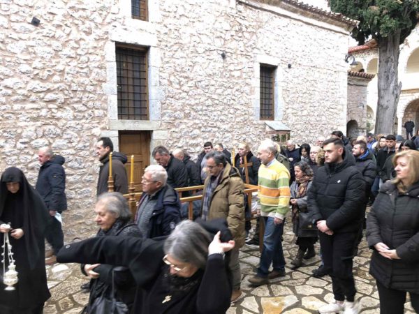 Τον Σεβασμιώτατο κ. Συμεών πλαισίωσαν ο Άγιος Πρωτοσύγκελλος της Ιεράς Μητροπόλεως Αρχιμ. του Οικουμενικού Θρόνου π. ΕφραίμΤριανταφυλλόπουλος, οι Καθηγούμενοι των Ιερών Μονών Αγάθωνος Αρχιμ. π. Γερμανός Γιαντσίδης, ΑντινίτσηςΑρχιμ. π. Αμβρόσιος Αναστασίου, καθώς και άλλοι Ιερείς της Μητροπόλεως, ενώ παρέστη και η Καθηγουμένη της Ιεράς Μονής Αγίου Γεωργίου Μύλων Γερόντισσα Ιουστίνα και μοναχές Μονών της Ιεράς Μητροπόλεως, καθώς και πλήθος πιστών, πνευματικών τέκνων της Μονής, παρά το δριμύ ψύχος και εκπρόσωποι του Δήμου Λαμιέων.