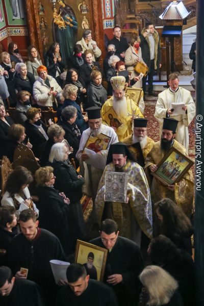 Στον Ιερό Μητροπολιτικό και Καθεδρικό Ναό Ευαγγελισμού της Θεοτόκου Λαμίας εορτάστηκε σήμερα η Κυριακή της Ορθοδοξίας υπό του Σεβασμιωτάτου Μητροπολίτου Φθιώτιδος κ. Συμεών, σε απευθείας μετάδοση από τηλεοράσεως, ραδιοφώνου και διαδικτύου και με την παρουσία του Βουλευτή Φθιώτιδος κ. Γεωργίου Κοτρωνιά, της Αντιπροέδρου του Δημοτικού Συμβουλίου Λαμιέων κ. Νάγιας Φαρδή, του Αντιδημάρχου κ. Δημητρίου Κυρίτση, της Διοικητού των Π.Υ. ΒΙ. ΠΕ. Λαμίας Αντιπυράρχου Γιαννούλας Γιάννη, Αξιωματικών του Στρατού και της Αστυνομίας, εκπροσώπων φορέων και συλλόγων και πλήθους πιστών.