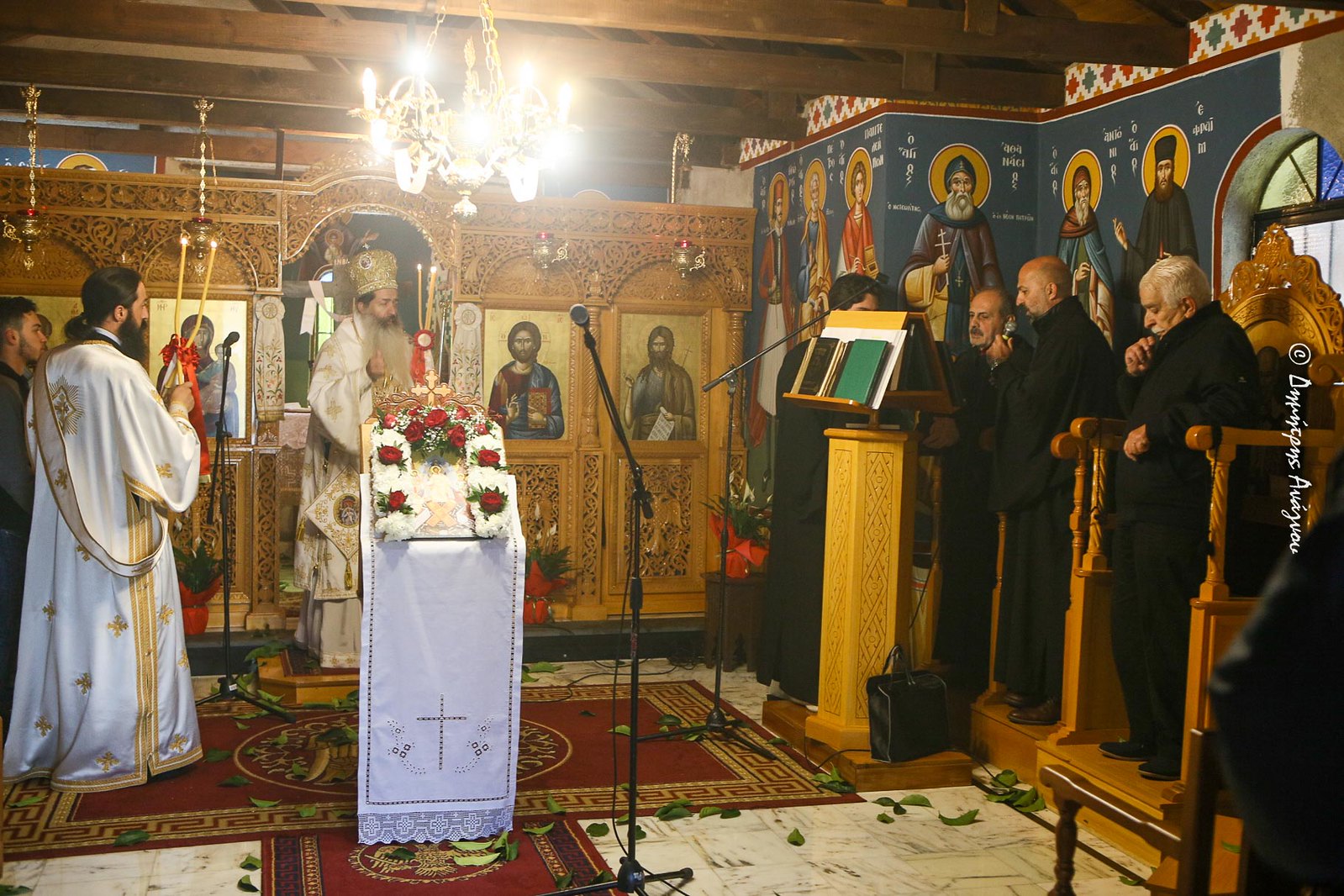 Τον Σεβασμιώτατο κ. Συμεών πλαισίωσαν ο Άγιος Καθηγούμενος της Μονής Αρχιμ. π. Παρθένιος Κουκούλης, οι πατέρες της Μονής αλλά και ιερείς που διακονούν το μοναστήρι και την περιοχή, ενώ το Ιερό Αναλόγιο πλαισίωσε χορός Ιεροψαλτών, υπό τον Πρωτοψάλτη του Ναού Αγίων Αποστόλων Λαμίας και Καθηγητή του Ωδείου της Ιεράς Μητροπόλεως Φθιώτιδος «Γερμανός ο Μελωδός» κ. Ευθύμιο Τσούμα, τη συνοδεία του Προέδρου του Συνδέσμου Ιεροψαλτών Ν. Φθιώτιδος «Νικόλαος Δοχειαρίτης» και Λαμπαδάριο του ως άνω Ιερού Ναού κ. Γεώργιο Παλιούρα.