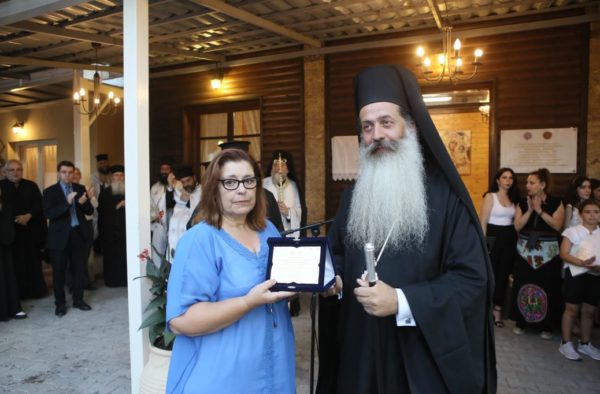 Ο Σεβασμιώτατος κ. Συμεών απένειμε τιμητική πλακέτα για την σπουδαία και ευγενική συμβολή της στο έργο του Παρατήματος του Ωδείου της Ιεράς Μητροπόλεως «Γερμανός ο Μελωδός» της Παραλίας Λιβανατών στην εταιρεία «ΣΥΡΜΟΣ – ΛΕΒΑΝΤΗΣ Α.Β.Ε.Ε. ROTOSAL επιδίδοντάς την στην ερίτιμη κ. Άννα Σύρμου – Λεβαντή.