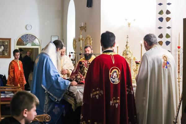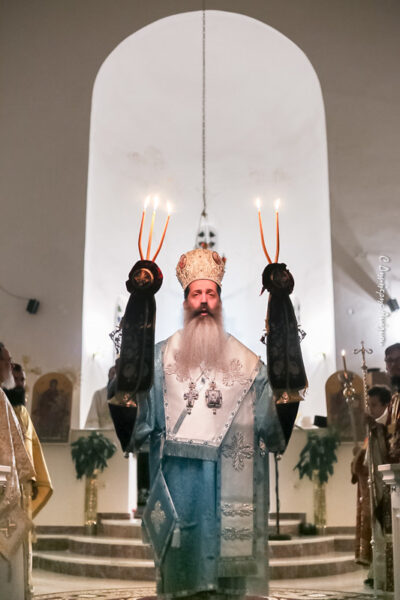 Ο π. Χρηστος προ της απολύσεως της Αρχιερατικής Θείας Λειτουργίας προσεφώνησε τον Σεβασμιώτατο και εκ μέρους όλων των ευχαρίστησε για την αγιαστική παρουσία του στην Ενορία, αναφερόμενος δι’ ολίγον στην Ιστορία του Ναού.