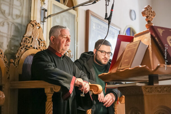 Τα Ιερά Αναλόγια διηκόνισαν επάξια ο Μουσικολογιώτατος Πρωτοψάλτης του Ναού, κ. Χρήστος Τσιρίγκας, πλαισιούμενος από Ιεροψάλτες, τη καλλικέλαδη παρουσία και συμμετοχή του Μουσικολογωτάτου Αρχιδιακόνου της Μητροπόλεως μας π. Ευσταθίου Κατόπη, καθώς και ο Λαμπαδάριος του Ναού κ. Χρήστος Φωτόπουλος.
