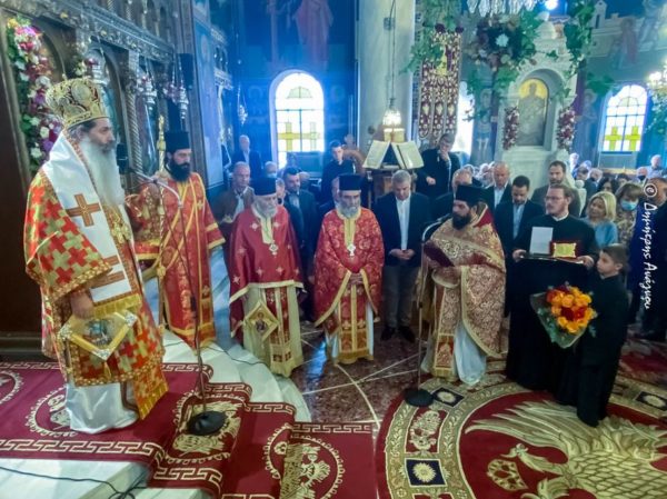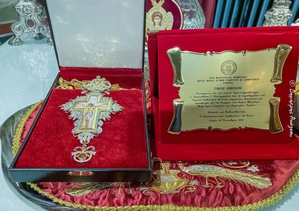 Ακόμη παρεκάλεσε τον Σεβασμιώτατο να απονείμει τον επιστήθιο σταυρό και την τιμητική πλακέτα στον πολιό Εφημέριο του Ναού Πρωτ. π. Δημοσθένη Κουτρομάνο επί τη συμπληρώσει του χρυσού Ιωβηλαίου των 50 ετών ιερωσύνης, προσφοράς και διακονίας στον Ιερό Ναό του Αγίου Δημητρίου Λαμίας.