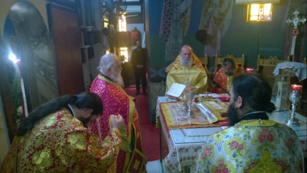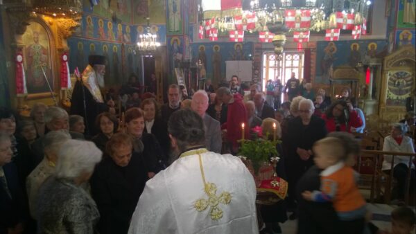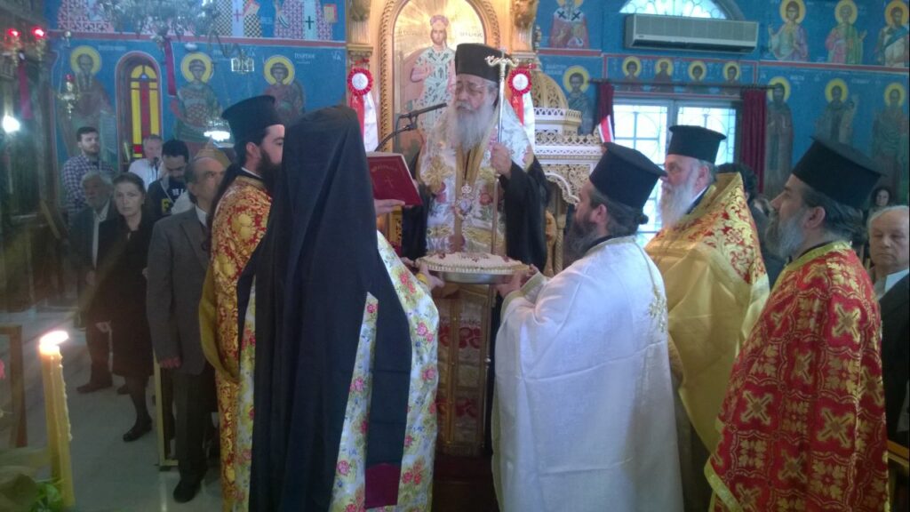 Προ της απολύσεως της Θείας Λειτουργίας, ο οικείος Ποιμενάρχης ευλόγησε τα κόλλυβα προς τιμήν του αγίου και ευχήθηκε τα δέοντα εις τον άγοντα τα ονομαστήριά του Προηγούμενο της Ιεράς Μονής Μεταμορφώσεως του Σωτήρος Καμένων Βούρλων και Προϊστάμενο του Ιερού Ναού Πανοσιολ. Αρχιμ. π. Χριστοφορο Κολοκυθά.