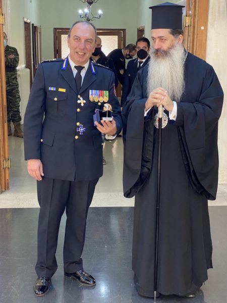 Ακολούθως στην Λέσχη Αξιωματικών Φρουράς Λαμίας ο Συντονιστής Πυροσβεστικών Υπηρεσιών Θεσσαλίας και Στερεάς Ελλάδος Υποστράτηγος Κωνσταντίνος Παχίδης απένειμε στον Σεβασμιώτατο τιμητική διάκριση για την προσφορά και συμπαράστασή του στο Σώμα.