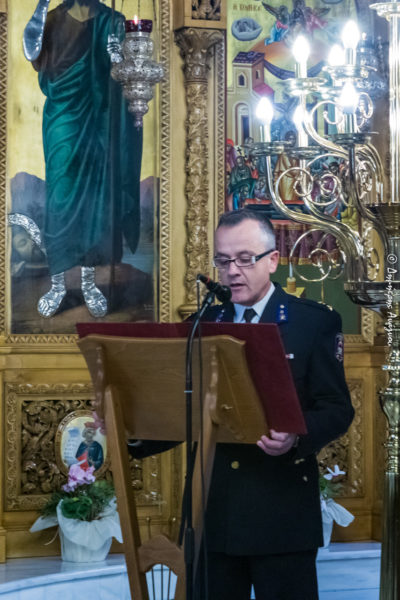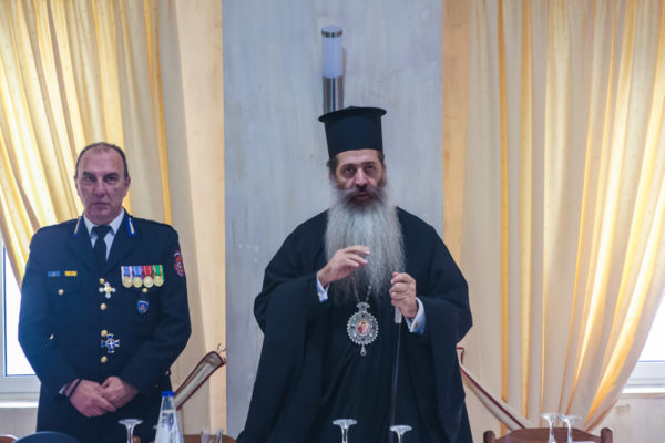 Μετά την ανάγνωση της ημερήσιας διαταγής του Αρχηγού του Πυροσβεστικού Σώματος Αντιστράτηγου Στέφανου Κολοκούρη, ο κ. Συμεών ευχήθηκε πατρικώς χρόνια πολλά και ευλογημένα σε όλα τα στελέχη του Πυροσβεστικού Σώματος και κατέθεσε ένα ακόμη καρδιακό ευχαριστώ για την προσφορά τους στην κοινωνία.