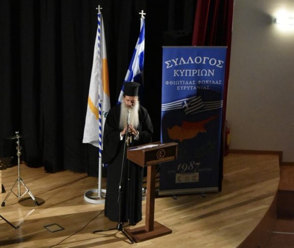 Στην πόλη της Λαμίας και στο Αμφιθέατρο της Ιεράς Μητροπόλεως πραγματοποιήθηκε η επετειακή εκδήλωση, σε συνεργασία της Ιεράς Μητροπόλεως Φθιώτιδος με τον Σύλλογο Κυπρίων Φθιώτιδος – Φωκίδος – Ευρυτανίας, η οποία τελούσε υπό την αιγίδα της Πρεσβείας της Κύπρου στην Ελλάδα, στην οποία κεντρικός ομιλητής ήταν ο Σεβασμιώτατος Μητροπολίτης Φθιώτιδος κ. Συμεών.