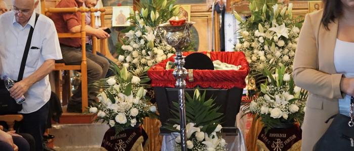 Την Εξόδιο τέλεσε ο Σεβασμιώτατος Μητροπολίτης Φθιώτιδος κ. Συμεών, συμπαραστατούμενος από τον Αρχιερατικό Επίτροπο Αμφικλείας Αιδεσιμολ. Πρωτ. π. Διομήδη Παναγιωτόπουλο, σύσσωμο τον Ιερό Κλήρο της περιοχής, παρουσία της Δημάρχου Αμφίκλειας-Ελάτειας κ. Αθανασίας Στιβακτή.
