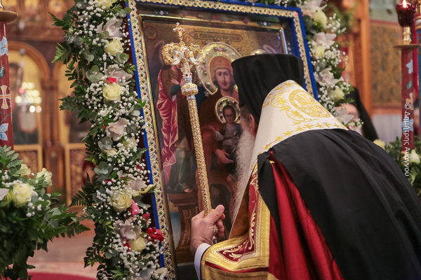 Η Παναγία αυτό μας αποδεικνύει με κάθε τρόπο. Πρώτιστα με τον τρόπο με τον οποίο η ίδια έζησε, με τον τρόπο με τον οποίο η ίδια ετοιμάστηκε για να γίνει σκεύος εκλογής ώστε να σαρκώσει μέσα στα Άχραντα Σπλάχνα μας τον Υιό και Λόγο του Θεού. Η Παναγία με την ταπείνωσή της, με τη σιωπή της, με την υπακοή της, αλλά και με τη σπουδή της στο Θέλημα του Θεού, με το πώς πορεύτηκε πάνω στον Γολγοθά, πάνω στο δρόμο του Χριστού, μέσα στον Τάφο και μετά στο Κενό Μνημείο και σε όλη την πορεία του σχεδίου μέχρι και η ίδια να μετασταθεί και να βρεθεί στη θέση της, η Πλατυτέρα των Ουρανών, πάντοτε ένα πράγμα προσφέρει στους ανθρώπους, σε όλους εμάς. Τον δρόμο για τον Χριστό! Και με τα θαύματά της, με την παρουσία της στα σεβάσματα, η Παναγία είναι παντού, γιατί είναι η μητέρα μας και έστω και αν μπορεί εμείς ως άνθρωποι να σφάλλουμε, να αμαρτάνουμε, να την πληγώνουμε, να την στενοχωρούμε η Παναγία μας αγαπά και μας έχει μέσα στην αγκαλιά της. Η Παναγία η Δαμάστα, η Παναγία η Αγαθωνίτισσα, η Παναγία η Γαυριώτισσα, η κάθε Παναγία, η Παναγία κάθε εκκλησίας, κάθε σπιτιού, η Παναγία που είναι στις χάρτινες εικονίτσες στα κρεβάτια των ασθενών στο νοσοκομείο μας, η Παναγία που είναι στην καρδιά τυπωμένη του κάθε ανθρώπου είναι προστάτης και έφορος της ζωής μας, αλλά πολλώ δε μάλλον όταν έχουμε τη χάρη να μπορούμε λίγο, να πάρουμε λίγο από την αλμύρα του Ιονίου πελάγους, να πάρουμε λίγο από τη χάρη της Ιεράς Νήσου των Λευκαδίων, από την εμπειρία των Λευκαδίων, διότι αυτό το οποίο κομίζετε σήμερα δεν είναι ένα εικόνισμα απλώς, αλλά είναι μία εμπειρία ζωής. Είναι μία εμπειρία την οποία και εσείς την παραλάβατε ως παρακαταθήκη, την κρατάτε ως παρακαταθήκη πολύτιμη για να την προσφέρετε και στις επόμενες γενεές όχι μόνο των μοναζόντων και των μοναζουσών, αλλά και όλης της Εκκλησίας του Χριστού. Δεν υπάρχει Λευκαδίτης που να μην καυχάται για την Παναγία την Πεφανερωμένη. Δεν υπάρχει Ιονοπελαγίτης που να μην καυχάται, δεν υπάρχει Δυτικοστερεοελλαδίτης που να μην καυχάται, δεν υπάρχει Ρουμελιώτης που να μην καυχάται, δεν υπάρχει Έλληνας που να μην καυχάται, δεν υπάρχει χριστιανός που να μην καυχάται και να μη θαυμάζει και να μην έχει να διηγηθεί έστω ένα θαυμαστό γεγονός, το οποίο είτε ο ίδιος έζησε είτε ο ίδιος το πληροφορήθηκε είτε ο ίδιος με κάποιον τρόπο το έκανε κτήμα του μέσα στην εμπειρία της ζωής του.