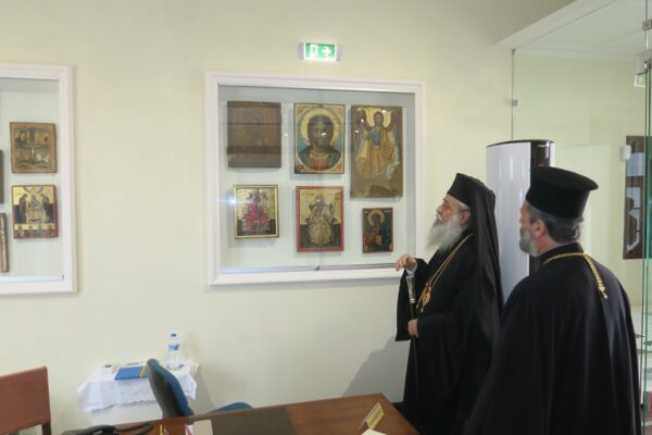 Τέλος ο Σεβασμιώτατος ξεναγήθηκε στις αίθουσες των Μουσείων του Πανιέρου Ιδρύματος και εδέχθη την αβραμιαία φιλοξενία των πατέρων του Ναού και των μελών της Διοικούσης Επιτροπής του Ιδρύματος.