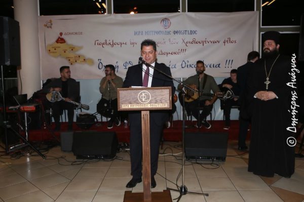 «Σας καλωσορίζομε με χαρά στην αποψινή εορταστική εκδήλωση της Ιεράς Μητροπόλέως μας και σας ευχαριστούμε για την ανταπόκρισή σας σ’ αυτό το κάλεσμα της τοπικής μας Εκκλησίας, για να γιορτάσουμε όλοι μαζί την αποκριά των Χριστουγέννων εφέτος στον ιστορικό Δήμου του Δομοκού και να αποδείξουμε με την παρουσία μας ότι είμαστε «Όλη η Φθιώτιδα μία οικογένεια».