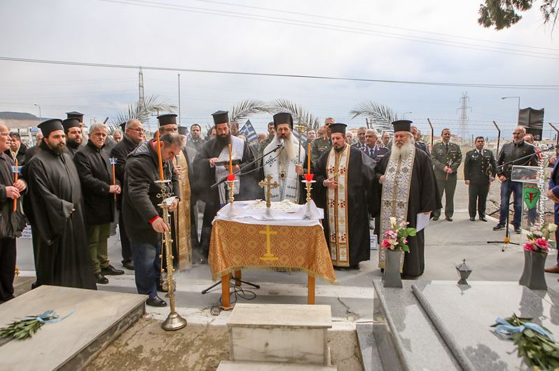 Ακολούθως και μετά το Αρχιερατικό Τρισάγιο εντός του Ναού, ο Σεβασμιώτατος μετέβη στο Στρατιωτικό Κοιμητήριο το οποίο ευρίσκεται εντός του Δημοτικού Κοιμητηρίου, όπου κατόπιν προσκλήσεως του Ανωτάτου Διοικητού Φρουράς Λαμίας, Ταξιάρχου Αρίστου Περρή, Διοικητού του ΚΕΥΠ, παρουσία του Εξοχωτάτου Υπουργού των Οικονομικών κ. Χρήστου Σταϊκούρα και απάσης της Πολιτικής και Στρατιωτικής Ηγεσίας, ετέλεσε Αρχιερατικό Τρισάγιο, αναπέμποντας δέηση προς τον Πανάγαθο Θεό, υπέρ αναπαύσεως της ψυχής πάντων των υπέρ της Πίστεως και της Πατρίδος, ηρωικώς αγωνισαμένων και πεσόντων εν τοις Ιεροίς του Έθνους ημών αγώσι, πάλαι τε και επεσχάτων.