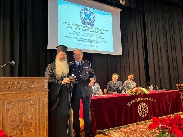 Η εκδήλωση έλαβε χώρα στο Αμφιθέατρο του Πνευματικού – Διοικητικού Κέντρου της Ιεράς Μητροπόλεως Φθιώτιδος ενώ ο Σεβασμιώτατος κ. Συμεών απηύθυνε χαιρετισμό στην εκδήλωση. Στο τέλος, ο Γενικός Περιφερειακός Αστυνομικός Διευθυντής Στερεάς Ελλάδας, Υποστράτηγος Σπυρίδων Σκλάβος, απένειμε τιμητικές πλακέτες στον Μητροπολίτη Φθιώτιδος, τον οποίο ευχαρίστησε θερμά τόσο για την παραχώρηση του Πνευματικού – Διοικητικού Κέντρου προκειμένου να πραγματοποιηθεί η Ημερίδα, όσο κυρίως για την αγάπη και την αμέριστη στήριξη και συμπαράστασή του στο Αστυνομικό προσωπικό.