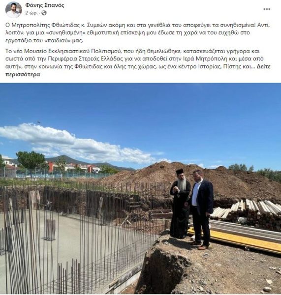«Ο Μητροπολίτης Φθιώτιδας κ. Συμεών ακόμη και στα γενέθλιά του αποφεύγει τα συνηθισμένα! Αντί, λοιπόν, για μια «συνηθισμένη» εθιμοτυπική επίσκεψη μου έδωσε τη χαρά να του ευχηθώ στο εργοτάξιο του «παιδιού» μας. Το νέο Μουσείο Εκκλησιαστικού Πολιτισμού, που ήδη θεμελιώθηκε, κατασκευάζεται γρήγορα και σωστά από την Περιφέρεια Στερεάς Ελλάδας για να αποδοθεί στην Ιερά Μητρόπολη και μέσα από αυτήν, στην κοινωνία της Φθιώτιδας και όλης της χώρας, ως ένα κέντρο Ιστορίας, Πίστης και Πολιτισμού! Εις έτη πολλά, Σεβασμιώτατε!», αναφέρει το μήνυμα του Περιφερειάρχη κ. Σπανού.