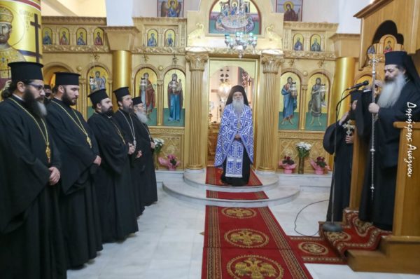 Στον Πανηγυρικό Αρχιερατικό Εσπερινό, ο οποίος μεταδόθηκε απευθείας μέσω της ερτζιανών του Ραδιοφωνικού Σταθμού της Ιεράς Μητροπόλεως Φθιώτιδος (89,4 Fm) και από διαδικτύου σε όλο τον κόσμο, χοροστάτησε ο Σεβασμιώτατος Μητροπολίτης Φθιώτιδος κ. Συμεών, πλαισιούμενος από το Άγιο Πρωτοσύγκελλο της Ι. Μ. Αρχιμ. του Οικουμενικού Θρόνου π. Εφραίμ Τριανταφυλλοπυλο, τον Αρχιερατικό Επίτροπο Λαμίας και Διευθυντή του Γενικού Φιλοπτώχου Ταμείου της Ι.Μ. Φθιώτιδος, Πρωτ. π. Παναγιώτη Σερέτη και άλλους Πατέρες.