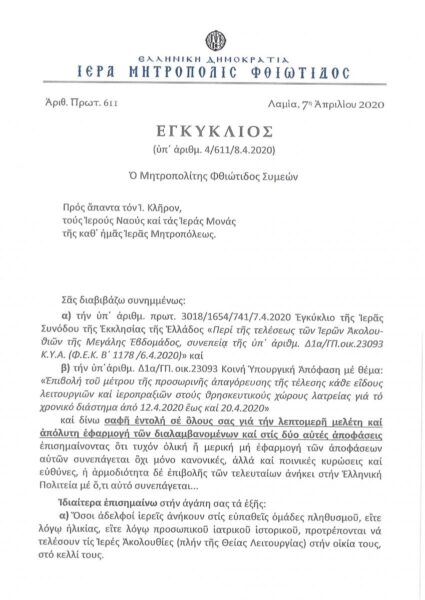 Εγκύκλιο διαβίβασε ο Σεβασμιώτατος Μητροπολίτης Φθιώτιδος κ. Συμεών προς άπαντα τον Ιερό Κλήρο και τις Ιερές Μονές της Ιεράς Μητροπόλεως, ενόψει των Ακολουθιών της Μεγάλης Εβδομάδος 2020, όπου, καθώς αναφέρει, μεταξύ άλλων: “Οι καμπάνες θα χτυπήσουν ΜΟΝΟ τη Μεγάλη Παρασκευή πένθιμα και κατά την Τελετή της Αναστάσεως πανηγυρικά”.