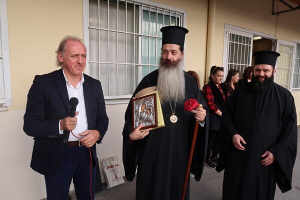 Τον Σεβασμιώτατο καλωσόρισε ο κ. Παναγιώτης Τάκης και εκ μέρους όλων τον ευχαρίστησε για την τιμητική και αγιαστική επίσκεψή του στο σχολείο. Του επέδωσε δε ως ενθύμιο της επισκέψεως του μία εικόνα της Παναγίας, συνοδευόμενη με τις ευχές για καλή Ποιμαντορία, υγιή και θεάρεστη. Αμέσως δε, τον παρεκάλεσε να απευθύνει στα παιδιά τους πατρικούς του λόγους και την ευλογία του.