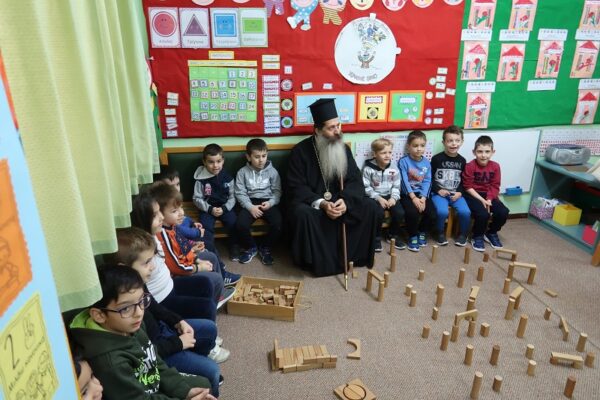 Τέλος, ο Σεβασμιώτατος επισκέφθηκε και του πολύ μικρούς μαθητές και μαθήτριες του 13ου Νηπιαγωγείου Λαμίας, όπου με πολλή αγάπη και στοργή τους ευλόγησε, τους ωμίλησε και τους έδωσε ευλογίες και γλυκά.