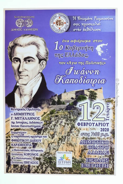Στο κατάμεστο από κόσμο Δημοτικό Θέατρο της πόλης της Λαμίας, παρέστη το απόγευμα της Τετάρτης 12 Φεβρουαρίου, ο Σεβασμιώτατος Μητροπολίτης Φθιώτιδος κ. Συμεών, αποδεχόμενος την ευγενική πρόσκληση του Προέδρου του Σωματείου «Ενωμένη Ρωμηοσύνη» κ. Ευαγγέλου Στεφανή, προκειμένου να παρακολουθήσει την πολύ ενδιαφέρουσα εκδήλωση τιμής και σεβασμού στον πρώτο Κυβερνήτη του Ελεύθερου Ελληνικού Κράτους Ιωάννη Καποδίστρια, την οποία διοργάνωσε η «Ενωμένη Ρωμηοσύνη» και ο Δήμος Λαμιέων και να απευθύνει τον πατρικό του λόγο.