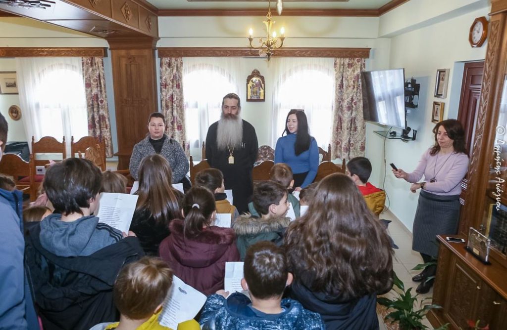 Ο κ. Συμεών, στο πλαίσιο των επισκέψεων που δέχεται καθημερινά στο γραφείο του, δέχθηκε επίσκεψη από μαθητές και μαθήτριες του 23ου Δημοτικού Σχολείου Λαμίας, οι οποίοι και πραγματοποίησαν εκπαιδευτική επίσκεψη στις εγκαταστάσεις του Πνευματικού και Διοικητικού Κέντρου της Ιεράς Μητροπόλεως. Τα παιδιά, έκαναν το ωραιότερο δώρο στον κ. Συμεών, καθώς μαζί με τα όμορφα και ελπιδοφόρα χαμόγελά τους, του χάρισαν ένα τραγούδι με την καθοδήγηση της υπεύθυνης καθηγήτριας Μουσικής κ. Ευαγγελίας Γούβαλη, το οποίο και με παρότρυνση του Σεβασμιωτάτου, το χάρισαν και στους αναρίθμητους ακροατές του Ραδιοφωνικού Σταθμού, το πρόγραμμα του οποίου εκείνη την ώρα βρισκόταν στον «αέρα», πραγματοποιώντας συνάμα και επίσκεψη στις αίθουσες του Ωδείου της Ιεράς Μητροπόλεως «Γερμανός ο Μελωδός».