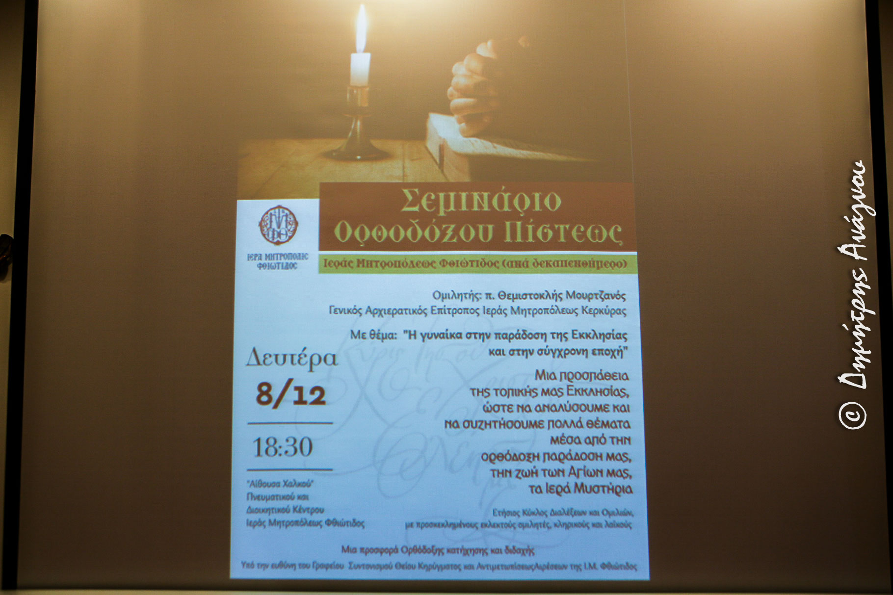 Προσκεκλημένος εισηγητής ήταν ο Γενικός Αρχιερατικός Επίτροπος της Ιεράς Μητροπόλεως Κερκύρας Αιδεσιμολ. Πρωτ. π. Θεμιστοκλής Μουρτζανός, ο οποίος ανέπτυξε με θεολογική εμβρίθεια και ρητορική δεινότητα το θέμα: «Η γυναίκα στην παράδοση της Εκκλησίας και την σύγχρονη εποχή».