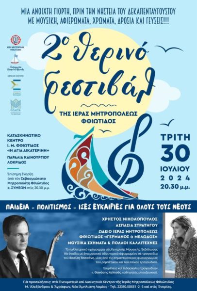 Η Ιερά Μητρόπολη Φθιώτιδος, σήμερα Τρίτη 30 Ιουλίου 2024, στο Κατασκηνωτικό Κέντρο της Ιεράς Μητροπόλεως «Η Αγία Αικατερίνη» στο Καινούργιο Λοκρίδος, και από τις 18:00 το απόγευμα έως τα μεσάνυχτα, διοργανώνει και εφέτος το 2ο Θερινό Φεστιβάλ, το οποίο είναι αφιερωμένο σε όλες τις εκπαιδευτικές δομές της Ιεράς Μητροπόλεως, όπως και αυτό που πραγματοποιήθηκε πέρυσι με μεγάλη επιτυχία.