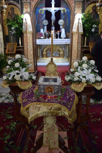 Το Ιερό θησαύρισμα εκόμισε, τη αδεία και ευλογία του Σεβασμιωτάτου Μητροπολίτου Φθιώτιδος κ. Νικολάου, ο Σεβασμιώτατος Μητροπολίτης Ζιχνών και Νευροκοπίου κ. Ιερόθεος, από την Ιερά Μονή αγίας Παρασκευής Ροδολείβους Σερρών, όπου φυλάσσεται.