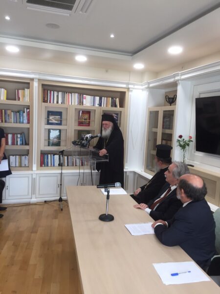 Κατά τον χαιρετισμό του ο Αρχιεπίσκοπος αναφέρθηκε στην σύλληψη της ιδέας να δημιουργηθεί ο συγκεκριμένος χώρος της Βιβλιοθήκης τονίζοντας πως «αυτό το έργο δεν απέβλεπε να φτάσει στην σημερινή ημέρα, αλλά να δώσει στα παιδιά, που ήθελαν κάτι καλύτερο, μία στέγη». Μοιράστηκε, επίσης, ότι κατά το παρελθόν σε μία επίσκεψή του σε ένα παλαιοπωλείο ανακάλυψε πεταμένα κάποια βιβλία και ένα πτυχίο ενός παλιού, αλλά γνωστού πολιτικού από την Βοιωτία και όταν ρώτησε τον παλαιοπώλη πώς τα απέκτησε εκείνος του απάντησε ότι οι απόγονοι του πολιτικού που τα είχαν κληρονομήσει ήθελαν να τα πετάξουν. Τότε, ο Αρχιεπίσκοπος αγόρασε αυτά τα αντικείμενα κι αμέσως του ήρθε η σκέψη να δημιουργήσει έναν χώρο στην γενέτειρά του, ώστε όσα βιβλία απέκτησε ο ίδιος να φυλαχθούν εκεί και για τις επόμενες γενιές. Αναφερόμενος στο συγκεκριμένο προπτυχιακό πρόγραμμα σπουδών ο Αρχιεπίσκοπος μοιράστηκε ένα ακόμη βίωμα από την προσωπική του ζωή.