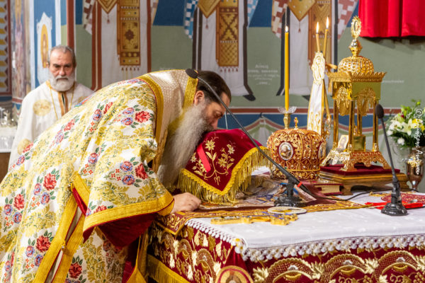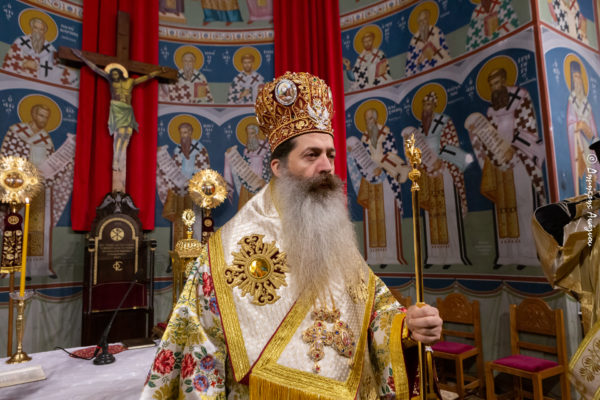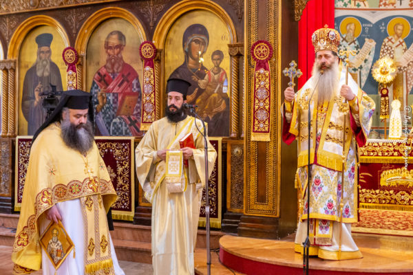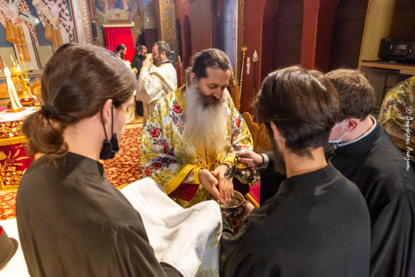 Προ της απολύσεως ο Άγιος Πρωτοσύγκελλος της Ιεράς Μητροπόλεως και Προϊστάμενος της Ενορίας, Πανοσιολ. Αρχιμ. π. Άγγελος Ανθόπουλος, με υιικά αισθήματα αγάπης, σεβασμού και τιμής, ευχαρίστησε τον Σεβασμιώτατο για την αγιαστική παρουσία του στο Ναό, στα πλαίσια της Ιεράς Πανηγύρεως, η οποία εορτάσθηκε κάτω από ειδικές συνθήκες προ ολίγων ημερών, τον ευχαρίστησε για την στήριξη και την πατρική αγάπη με την οποία περιβάλλει το ποιμαντικό και φιλανθρωπικό έργο της Ενορίας, αλλά τον ευχαρίστησε και για ένα ακόμη δώρο της αγαπώσης καρδίας του, την προσφορά παλαιού Δεσποτικού Θρόνου, του μακαριστού Μητροπολίτου Φθιώτιδος κυρού Αμβροσίου, ο οποίος ευρισκόταν στο Ιερό Παρεκκλήσιο του Αγίου Αμβροσίου στο Επισκοπικό Μέγαρο, το οποίο και φιλοκάλως ανακαίνισε.