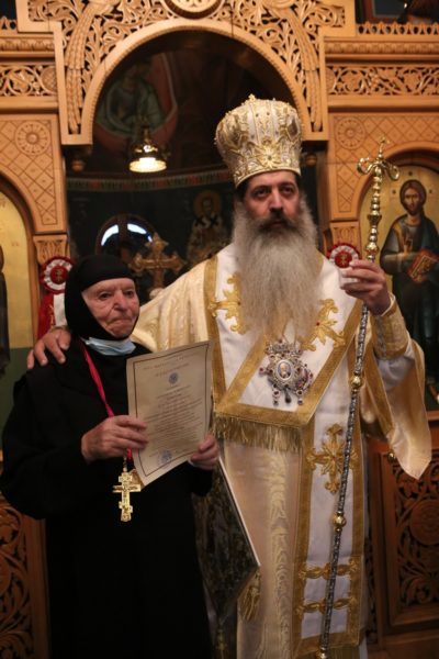Θέλω λοιπόν αφενός μεν να σας αποδώσω ισοβίως τον τίτλο της Καθηγουμένης, όχι απλώς Μοναχής Χαριτίνης. Καθηγουμένη Χαριτίνη θα ονομάζεται από σήμερα και όταν θα λειτουργούν οι Ιερείς εδώ θα μνημονεύεστε ως Καθηγουμένη. Και επίσης θα σας επιδώσω το Ανώτατο Παράσημο της Μητροπόλεως με ένα Μετάλλιο, το οποίο φέρει την εικόνα των Φθιωτών Αγίων εις ένδειξη τιμής και αναγνωρίσεως όλων όσων έχετε προσφέρει».