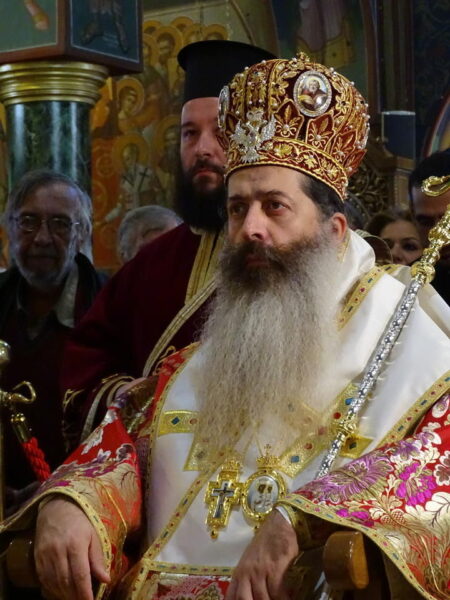 Στην πανήγυρή μας φέτος, φιλοξενούμε υψηλά πρόσωπα, δύο υψηλούς επισκέπτες, δύο αδελφούς Αρχιερείς. Τον προεξάρχοντα σήμερα στην Ευχαριστιακή Σύναξη, Σεβασμιώτατο Μητροπολίτη Φθιώτιδος κ. Συμεών και τον χοροστατούντα χθές στον Εσπερινό Σεβασμιώτατο Μητροπολίτη Καλαβρύτων και Αιγιαλείας κ. Ιερώνυμο. Τους ευχαριστώ και τους δύο και τους καλωσορίζω μέσα πα’ την καρδιά μου στην προσφυγική αυτή Μητρόπολη.
