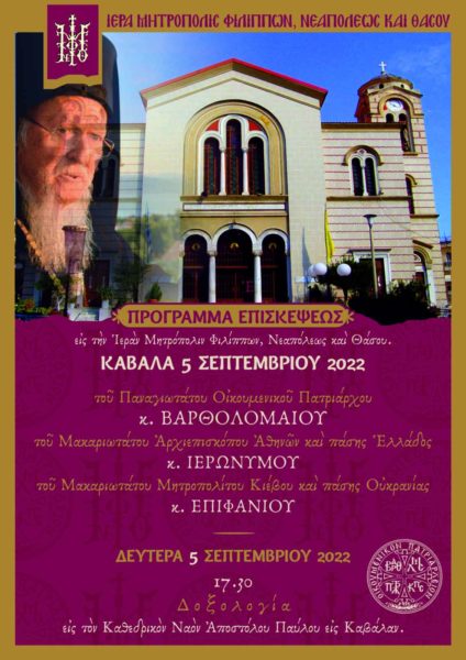 - Στις 5.30 το απόγευμα στον ιερό καθεδρικό Ναό του αγίου Αποστόλου ΠΑΥΛΟΥ τής Καβάλας για τήν ΥΠΟΔΟΧΗ του Οικουμενικού Πατριάρχου κ.κ. ΒΑΡΘΟΛΟΜΑΙΟΥ και τού Μητροπολίτου Κιέβου και πάσης Ουκρανίας κ.κ. ΕΠΙΦΑΝΙΟΥ και στήν επίσημη ΠΑΤΡΙΑΡΧΙΚΗ ΔΟΞΟΛΟΓΙΑ πού θα επακολουθήσῃ.