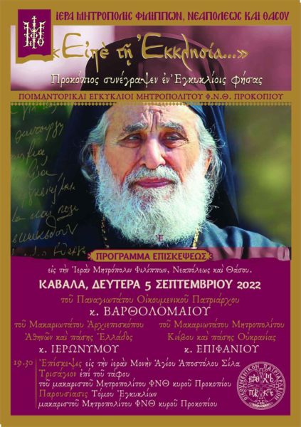 - ΤΗΝ ΚΥΡΙΑΚΗ 4 ΣΕΠΤΕΜΒΡΙΟΥ από τίς 7 το πρωΐ έως τίς 12 το μεσημέρι στον Όρθρο, στην ΠΑΤΡΙΑΡΧΙΚΗ ΘΕΙΑ ΛΕΙΤΟΥΡΓΙΑ στον ιερό Ναό τής Κοιμήσεως τής Θεοτόκου τής ΠΑΝΑΓΙΑΣ ΘΑΣΟΥ και στη συνέχεια στην ολιγόλεπτη παρουσίαση τού Εκκλησιαστικού Κειμηλιαρχείου «ΠΡΟΚΟΠΙΟΥ ΚΛΕΟΣ» μέσα στον ιερὀ Ναό πού είναι αφιερωμένο στον μακαριστό προκάτοχό μου Μητροπολίτη Φιλίππων, Νεαπόλεως και Θάσου κυρό ΠΡΟΚΟΠΙΟ.